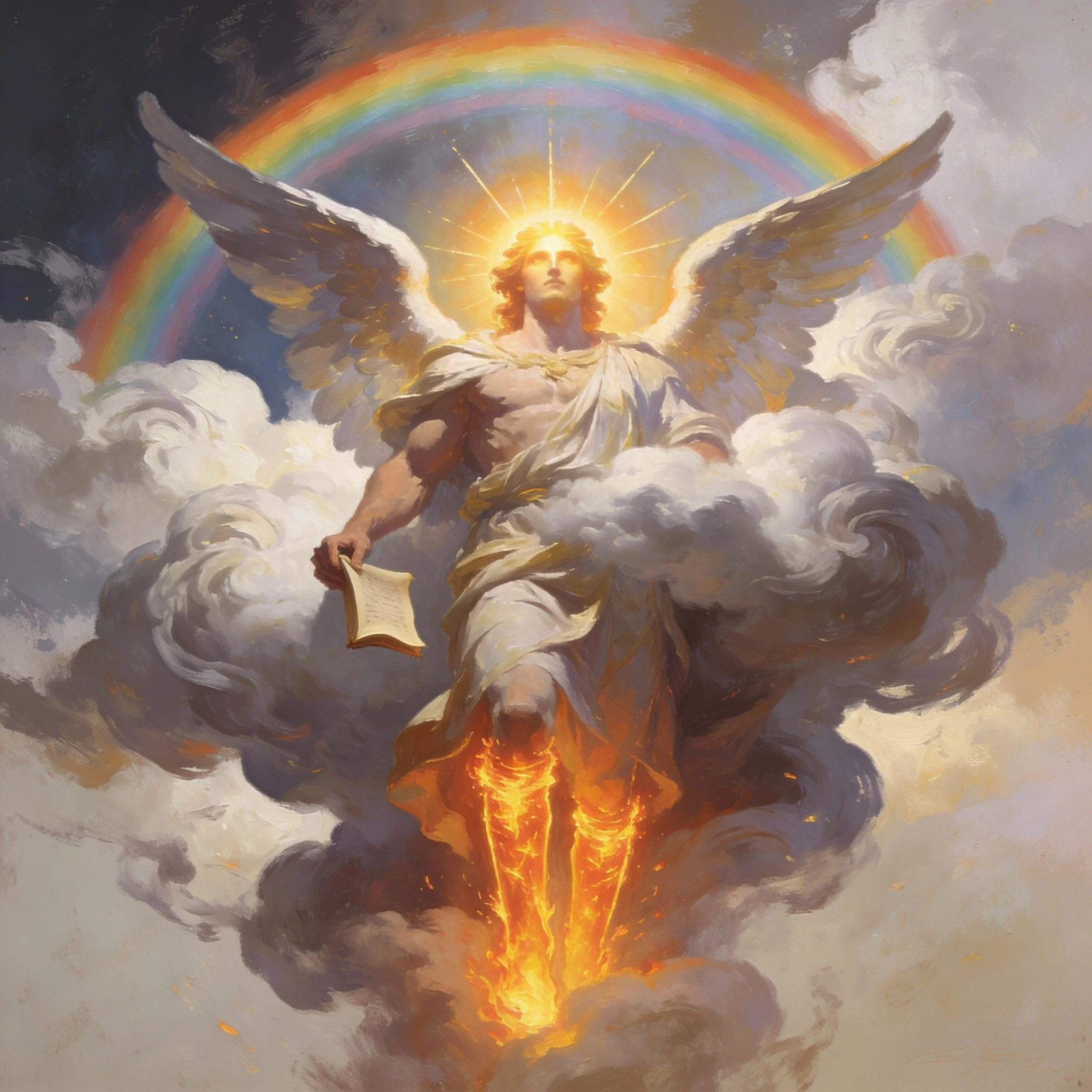 Revelation 10:1-2 Then I saw another mighty angel coming down from heaven, wrapped in a cloud, with a rainbow over his head, and his face was like the sun, and his legs like pillars of fire. He had a little scroll open in his hand.